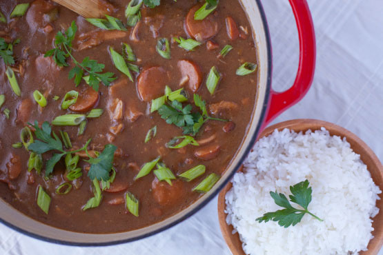 - In a large Dutch oven, over medium heat, combine the oil and flour. Cook, stirring constantly until dark brown (chocolate colored) for 20-30 minutes.