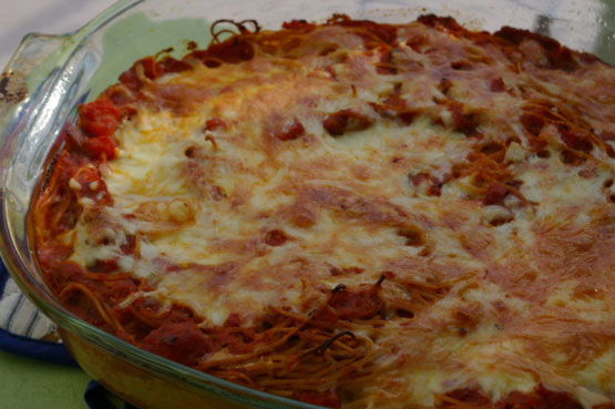- In a bowl, mix spaghetti sauce with tomatoes. Pour over spaghetti mixture.