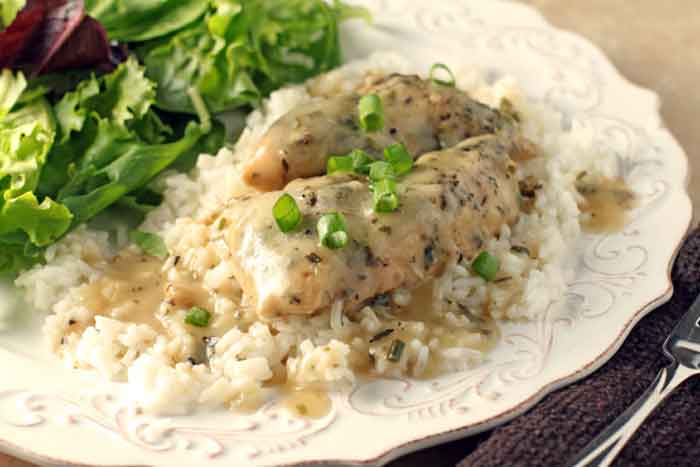 The boneless skinless chicken breasts gently cook through on a low temperature while the juices blend with the other ingredients.