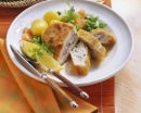 For an easy baked chicken recipe, try this updated twist of the traditional Chicken Cordon Bleu. Thinly pounded chicken breasts are rolled around string cheese and sliced ham, dipped in butter and bread crumbs, and baked to a luscious golden brown.