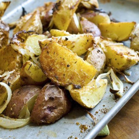 The potatoes are combined with some oil and garlic along with some other seasonings and then baked to a golden state.