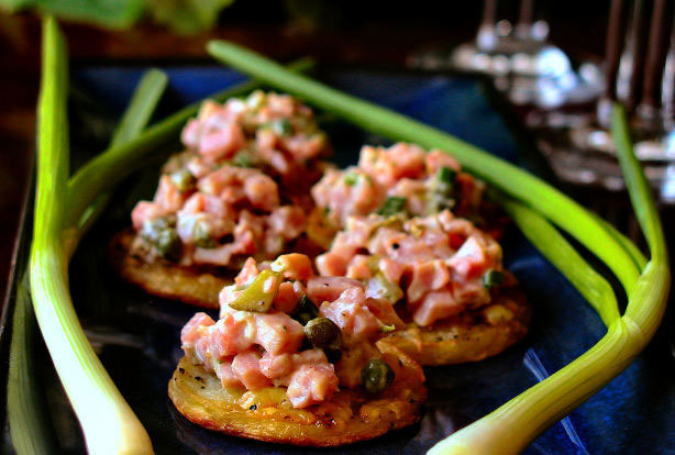- In a small bowl, combine the ham with the mayonnaise, scallion, Cornichons, capers, tarragon and mustard.