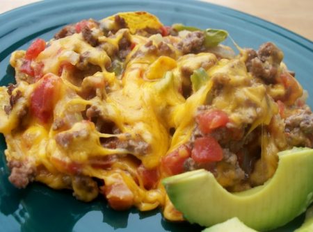 - Pour the tortilla chips into bottom of casserole dish (leave whole). Pour the beef mixture over the chips. Place the sliced cheese on top.